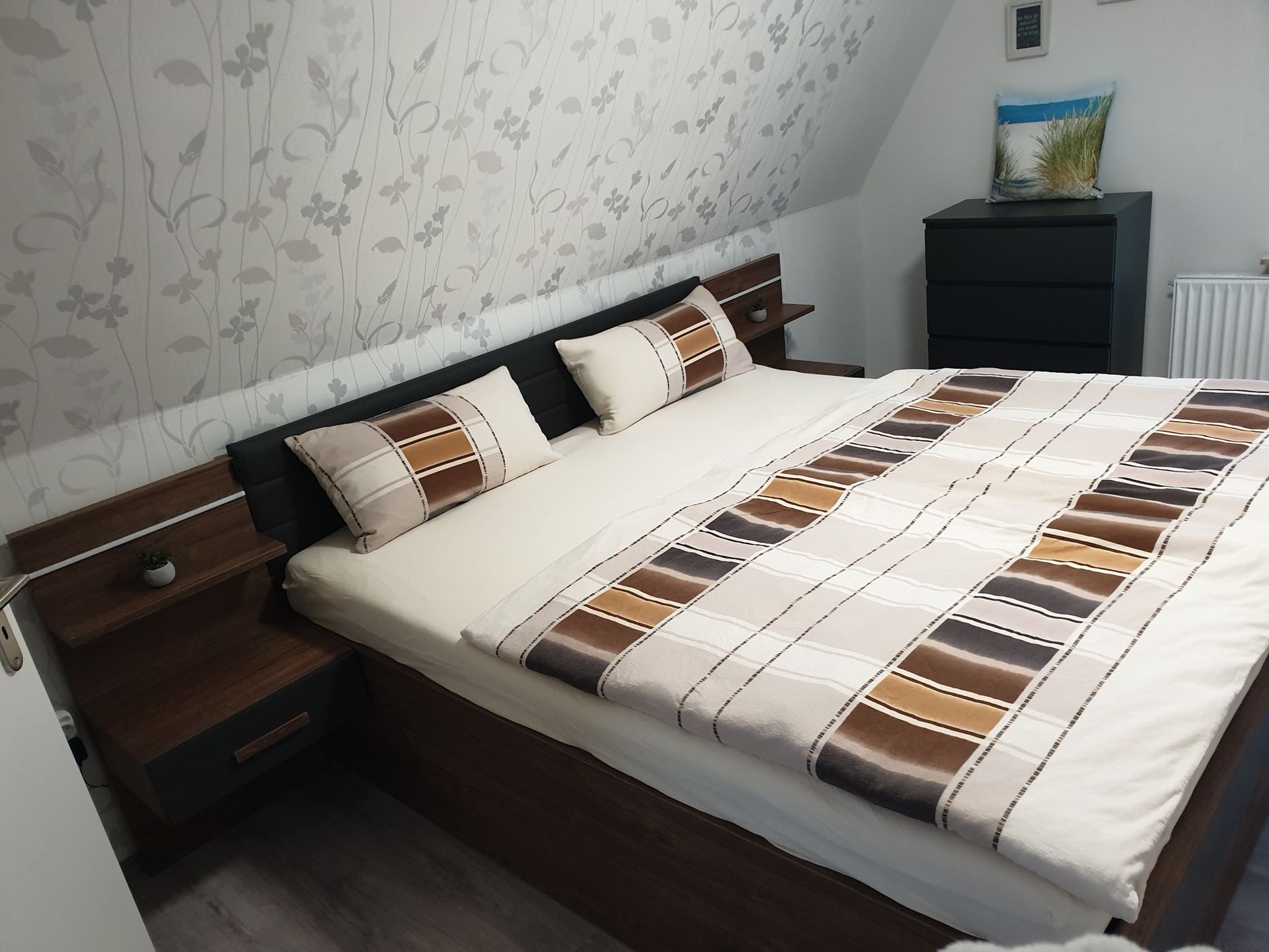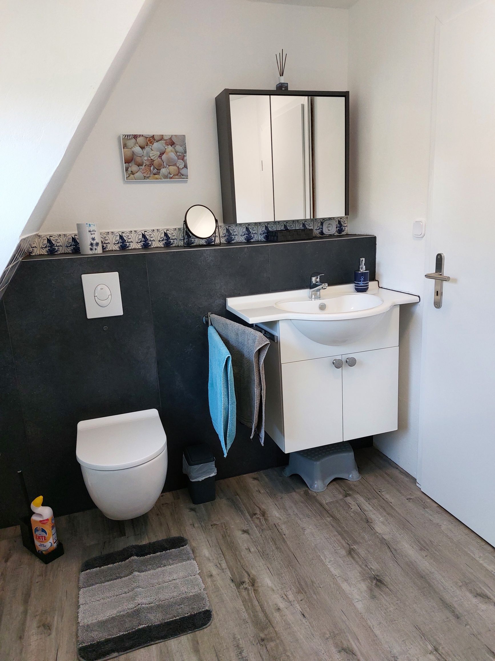 Im Obergeschoss befinden sich die anderen beiden geräumigen Schlafzimmer. Beide sind ausgestattet mit einem Doppelbett (180cm x 200cm) und Fernseher. Außerdem befindet sich dort noch ein kleines Bad mit WC und Waschbecken.
